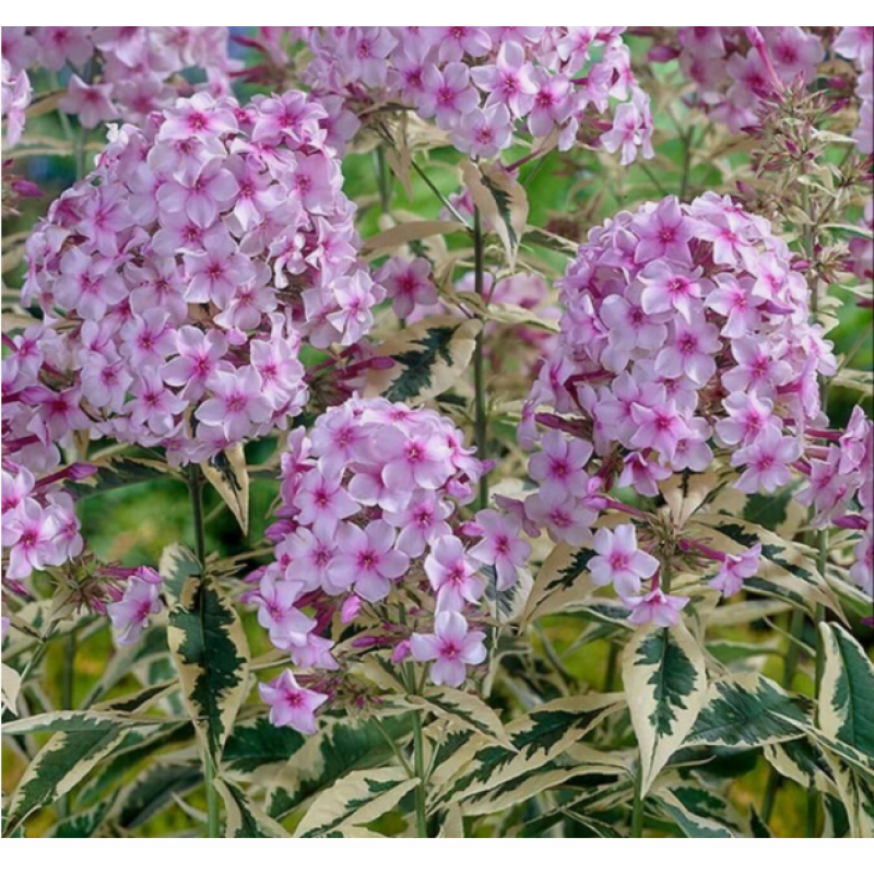 У флокса Крим де ля Менте двуцветная листва: центральная её часть тёмно зелёная,